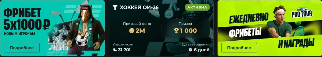 | Winter Games («Зимние игры») | Клиенты 18+ (по правилам акции) | Фрибеты по местам в лидерборде; общий фонд 2 000 000 | Сделать нужное число пари на хоккей ОИ-2026 и собрать состав хоккеистов; очки «гол+пас» | Правила акции (PDF) |